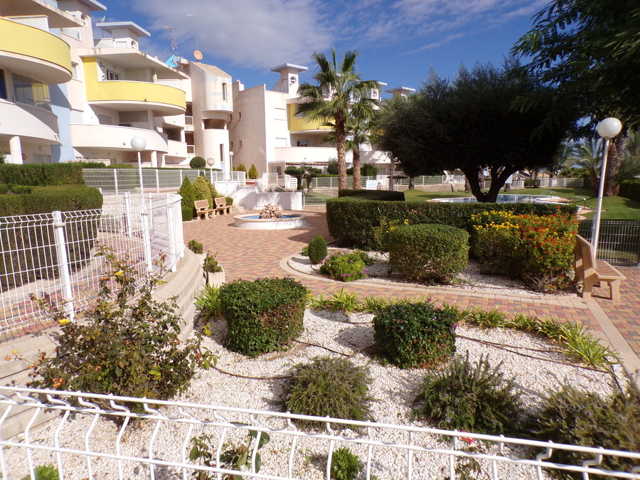 Ez egy makulátlan földszinti, két hálószobás és két fürdőszobás saroklakás, szép oldalsó, délkeleti fekvésű kerttel, az exkluzív Nova golfkomplexumban, pár perc sétára a Villamartin Plaza-tól.
